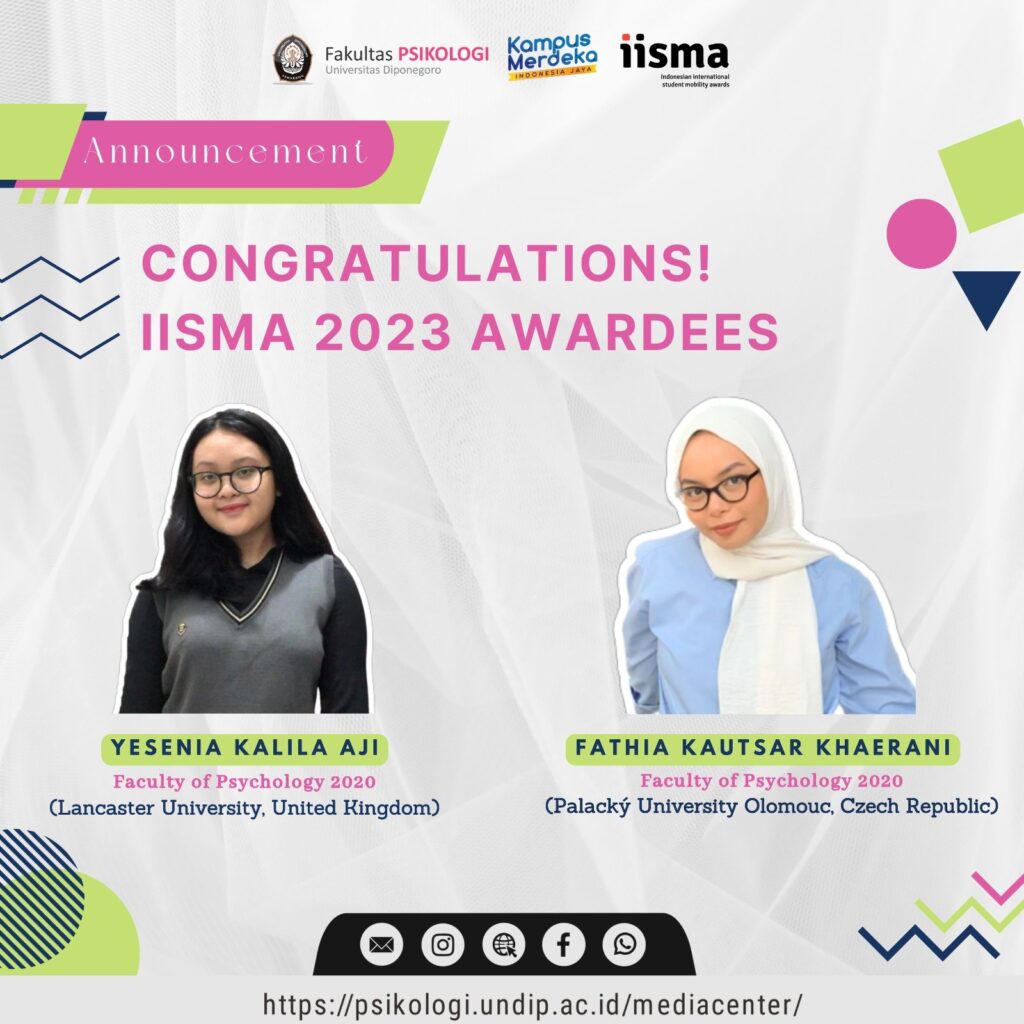 Ministry of Education, Culture, Research, and Technology of the Republic of Indonesia has published the list of OFFICIAL AWARDEES for the Indonesian International Student Mobility Awards (IISMA) 2023. We are delighted to share that two students from the 2020 batch of the Faculty of Psychology at Universitas Diponegoro have been chosen for the award.