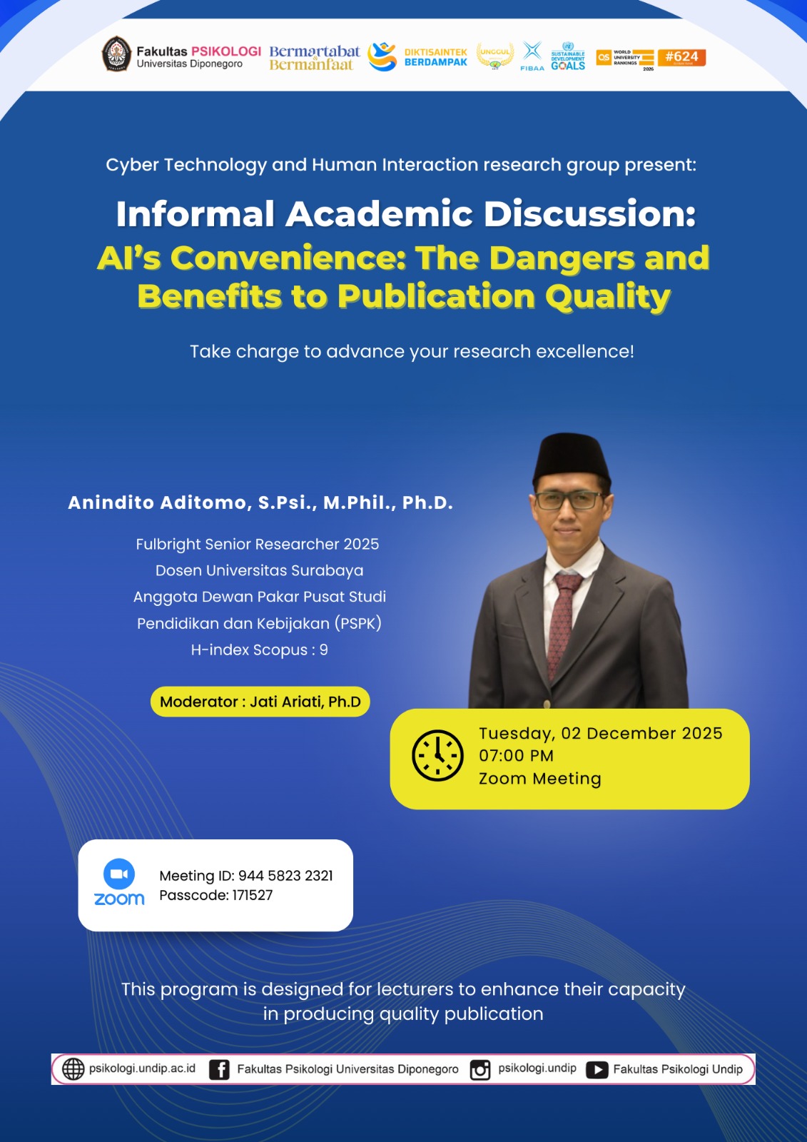 This four-session program reflects the commitment of the Cyber Technology and Human Interaction Research Group to promoting high-quality research, fostering international collaboration, and supporting the ongoing academic development of faculty members and students. The initiative marks an important step toward strengthening the research ecosystem within the Faculty of Psychology, Universitas Diponegoro.