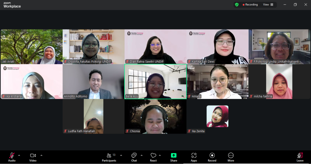 The International Research Group Joint Collaboration Program, proposed and initiated by Jati Ariati, S.Psi., M.Psi., Ph.D., and supported by research group members Dr. Nurul Hasfi, S.Sos., M.A. (Faculty of Social and Political Sciences) and Zulfa Safitri Kusumaningrum, S.Sos., M.Si., (Faculty of Humanities) under the Cyber Technology and Human Interaction Research Group, successfully held a four-part series of academic discussions designed to expand research networking, strengthen research competencies, and enhance publication quality. Conducted via Zoom Meeting, the events brought together lecturers and researchers committed to advancing their scholarly skills.