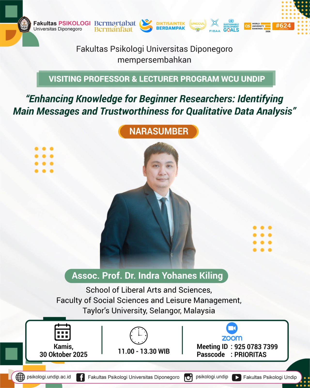 Fakultas Psikologi Universitas Diponegoro menyelenggarakan kegiatan Visiting Professor & Lecturer Program bertopik: “Enhancing Knowledge for Beginner Researchers: Identifying Main Messages and Trustworthiness for Qualitative Data Analysis” dengan narasumber Dr. Indra Yohanes Kiling, Associate Professor of School of Liberal Arts and Sciences, Faculty of Social Sciences and Leisure Management, Taylor’s University, Selangor, Malaysia.