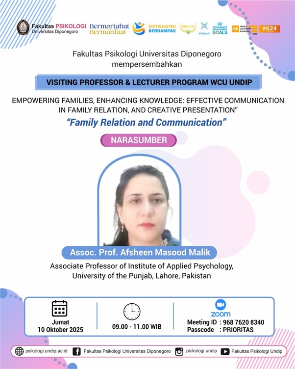 Kegiatan Visiting Professor & Lecturer diselenggarakan dua kali dengan menggundang Assoc. Prof. Afsheen Masood Malik, asosiate profesor of Institute of Applies Psychologi University of The Punjab, Lahore, Pakistan, dengan tema Empowering Families, Enhancing Knowledge: Effective Communication in Family Relation, and Creative Presentation. Kegiatan pertama diselenggarakan pada Jumat, 10 Oktober 2025, pukul 09.00-11.00 WIB yang diikuti oleh seluruh peserta mata kuliah pemberdayaan keluarga. Tema yang diangkat adalah “Family Relation and Communication”, dengan moderator Dr. Dinnie Ratri Desiningrum, M.Si.