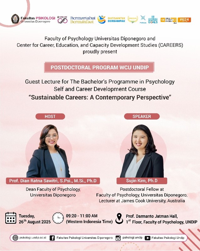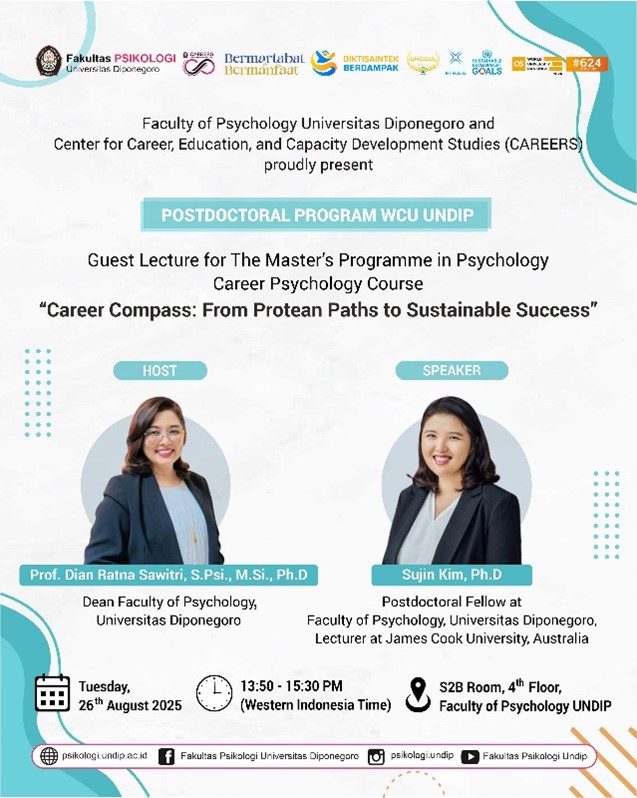 In the spirit of strengthening global academic networks and enriching students’ learning with cross-cultural perspectives, the Faculty of Psychology at Universitas Diponegoro (UNDIP) is organizing a series of international academic activities with Dr. Sujin Kim, International Postdoctoral Research Fellow from James Cook University (JCU), Australia, from August 1 to December 31, 2025, hosted by Prof. Dian Ratna Sawitri, Ph.D., Dean of the Faculty of Psychology UNDIP and Head of the Center for Career, Education, and Capacity Development Studies (CAREERS). Within this period, from August 23–31, 2025, Dr. Sujin Kim will be present at the Faculty of Psychology UNDIP.