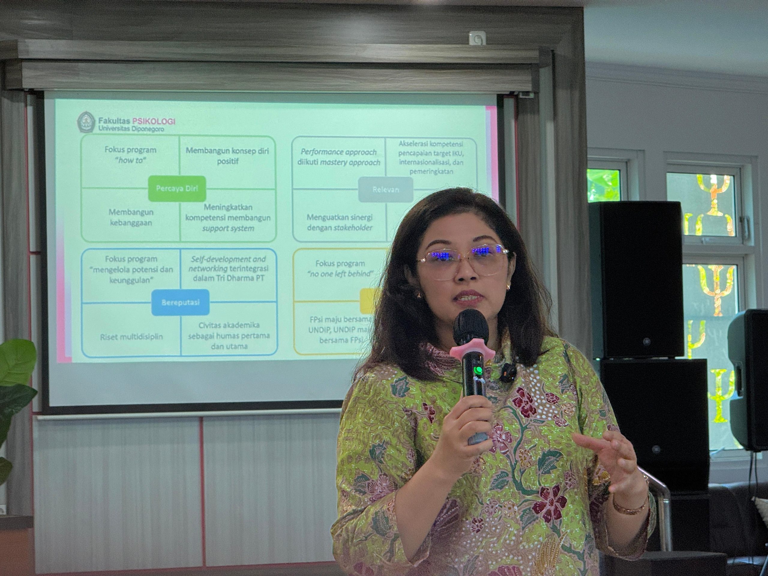 Dekan Fakultas Psikologi, Prof. Dian Ratna Sawitri, S.Psi., M.Si., Ph.D. menyampaikan visi dan misi Fakultas Psikologi UNDIP periode 2025–2029 yang menekankan pada penyelenggaraan pendidikan tinggi psikologi yang unggul, berbasis riset, dan berdampak bagi keluarga, komunitas, serta masyarakat global. Penyampaian kebijakan strategis fakultas mencakup prioritas program, penguatan sinergi antarbidang, serta peningkatan adaptabilitas institusi terhadap dinamika global.