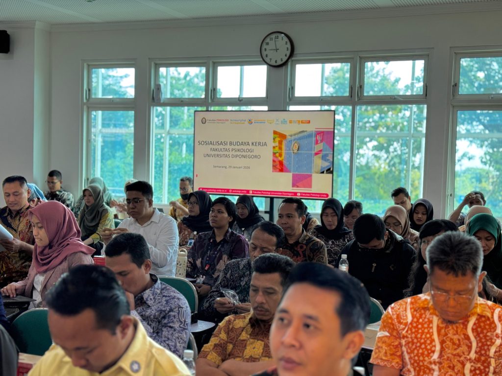 Fakultas Psikologi Universitas Diponegoro (UNDIP) menyelenggarakan kegiatan sosialisasi budaya kerja sebagai bagian dari upaya penguatan tata kelola kelembagaan dan peningkatan kinerja sivitas akademika. Kegiatan ini dilaksanakan pada 29 Januari 2026 dan terintegrasi dalam rangkaian agenda fakultas, termasuk monitoring dan evaluasi dosen tugas belajar serta rapat kerja awal tahun.