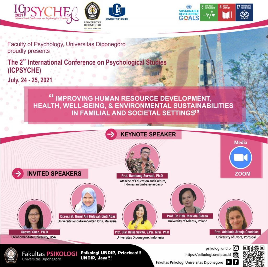 The 2nd International Conference on Psychological Studies (ICPsyche) 2021 “Improving human resource development, health, well-being, and environmental sustainabilities in familial and societal setting”, will be held virtually on July, 24-25 2021.
