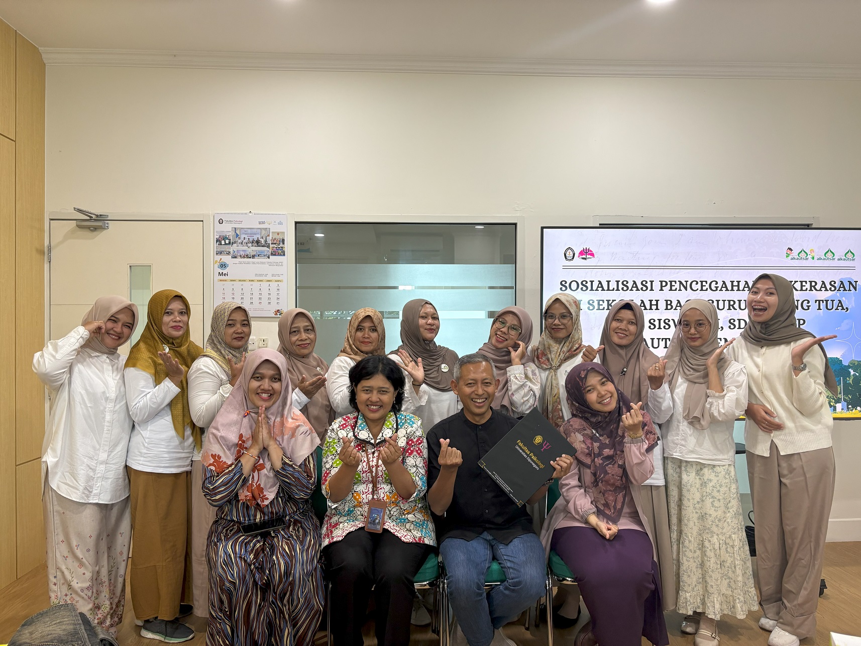 Tim pengabdian Fakultas Psikologi UNDIP menerima kunjungan guru-guru Yayasan Al Kautsar Temanggung (TK, SD, dan SMP) dalam rangka kegiatan pelatihan pencegahan kekerasan di lingkungan sekolah. Kegiatan ini membahas kesiapan petugas dan alur kanal pelaporan, serta penguatan tata kelola sekolah yang aman dan ramah anak sesuai Permendikbudristek No. 46 Tahun 2023. Diskusi juga mencakup persiapan pembentukan Tim Pencegahan dan Penanganan Kekerasan (TPPK) di lingkungan sekolah Al Kautsar.