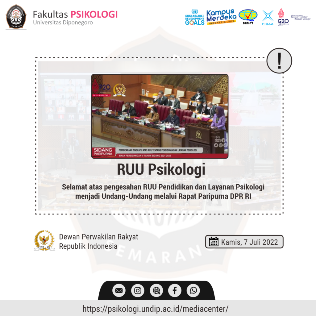 Fakultas Psikologi Universitas Diponegoro mengucapkan selamat atas telah disahkannya RUU Pendidikan dan Layanan Psikologi menjadi Undang-Undang melalui Rapat Paripurna DPR RI pada Kamis, 7 Juli 2022. Dalam rapat tersebut Hetifah Sjaifudin (Wakil Ketua Komisi X DPR RI) menyampaikan enam pokok bahasan atau substansi RUU tersebut antara lain.