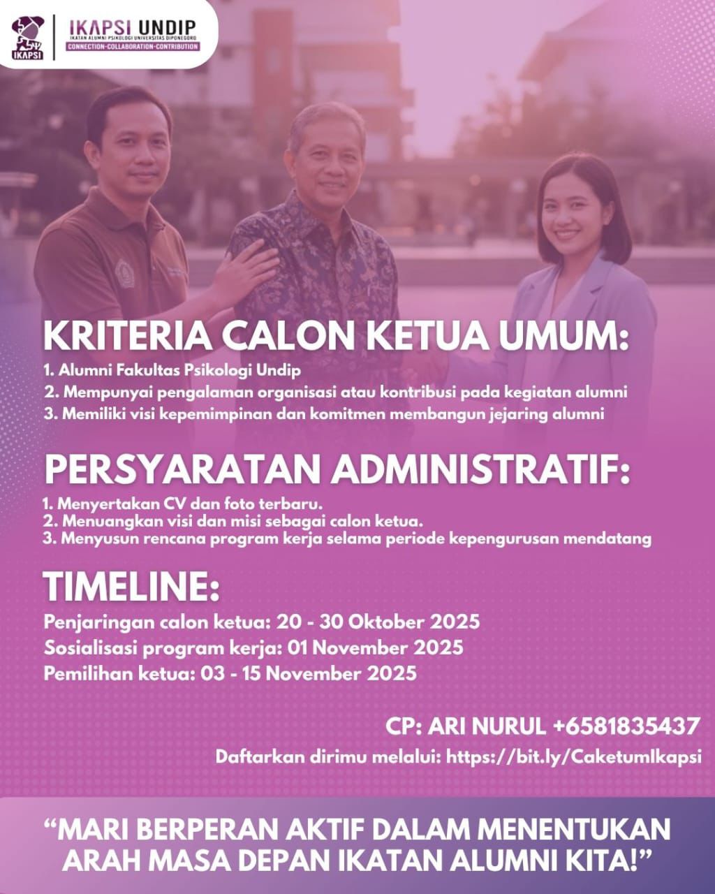 Enggak kerasa ya, kepengurusan IKAPSI UNDIP periode 2021–2025 udah mau berakhir. Sekarang waktunya kita nyari sosok baru buat melanjutkan estafet kepemimpinan sebagai Ketua Umum IKAPSI UNDIP periode 2026–2030. Kalau kamu punya pengalaman organisasi, semangat kolaborasi, dan pengen berkontribusi lebih buat alumni Psikologi UNDIP – yuk daftar jadi calon ketua!