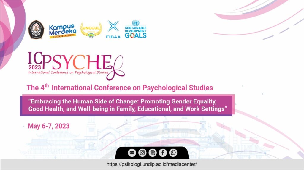 Fakultas Psikologi Universitas Diponegoro menyelenggarakan The 4th International Conference on Psychological Studies (ICPSYCHE) with the theme “Embracing the Human Side of Change: Promoting Gender Equality, Good Health, and Well-being in Family, Educational, and Work Settings” yang berlangsung pada 6-7 Mei 2023 secara daring.
