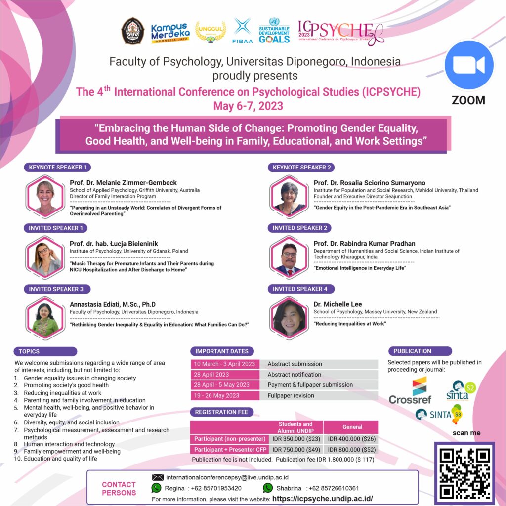 The 4th International Conference on Psychological Studies (ICPSYCHE) with the theme “Embracing the Human Side of Change: Promoting Gender Equality, Good Health, and Well-being in Family, Educational, and Work Settings“.