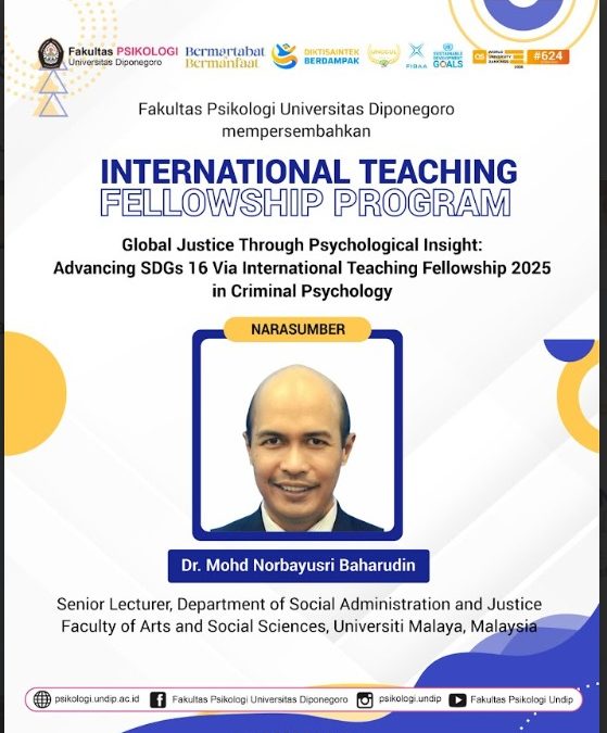 Semarang, 28 Oktober 2025 — Fakultas Psikologi Universitas Diponegoro mengadakan rangkaian kegiatan internasionalisasi melalui skema International Teaching Fellowship Program dengan tema “Global Justice Through Psychological Insight: Advancing SDG 16 Via International Teaching Fellowship 2025 in Criminal Psychology” yang mengundang Dr. Mohd Norbayusri Baharudin dari Department of Social Administration and Justice Faculty of Arts and Social Sciences, Universiti Malaya, Malaysia pada 21-25 Oktober 2025.