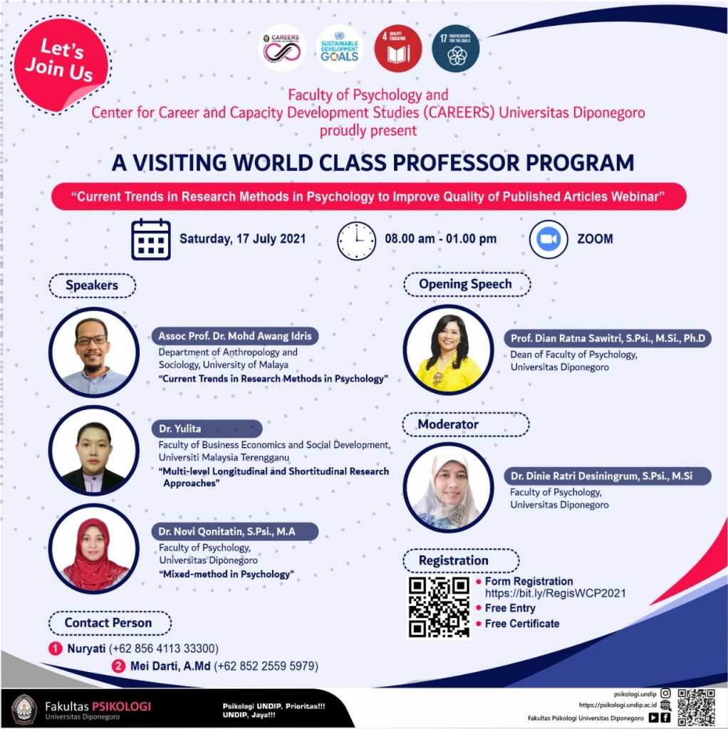 The Faculty of Psychology, University of Diponegoro, conducted a webinar for World Class Professor (WCP) Program on Saturday, 17 June 2021, 08.00 – 13.00 (Western Indonesian Time) with the theme “Current Trends in Research Methods in Psychology to Improve Quality of Published Articles.” This program took place from 17 July – 26 August 2021 and was become one of the programs that support UNDIP to be World Class University. The Faculty of Psychology invited Associate Professor Dr. Mohd Awang Idris from the Department of Anthropology and Sociology, University of Malaya, Malaysia. The University of Malaya is one of the world’s best QS100 universities that have become the Faculty of Psychology, the University of Diponegoro’s partner in “Tri Dharma PT.”